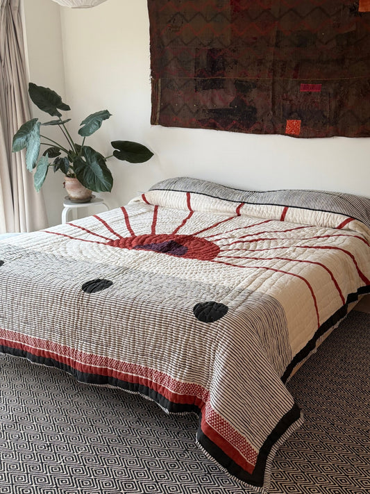 Quilted Kantha With Sun Pattern In Black, White and Red - KING