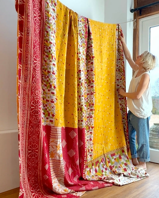 Super King Vintage Kantha Quilt in Yellow and Pink