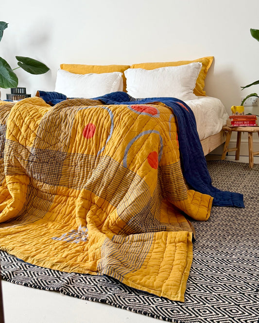 Quilted Kantha In Blue and Yellow With Geometric Patterns - SUPER KING