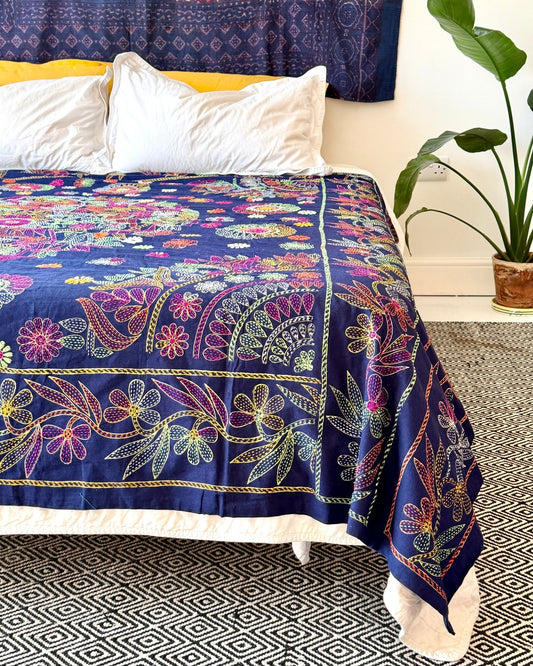 Embroidered Handmade Revival Nakshi Kantha Bedcover in Deep Blue