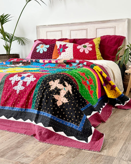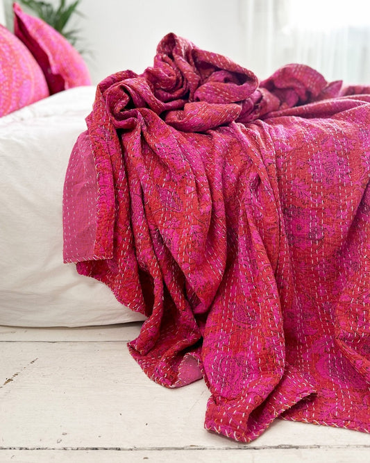 Hot Bright Pink Floral Kantha Quilt Bedspread
