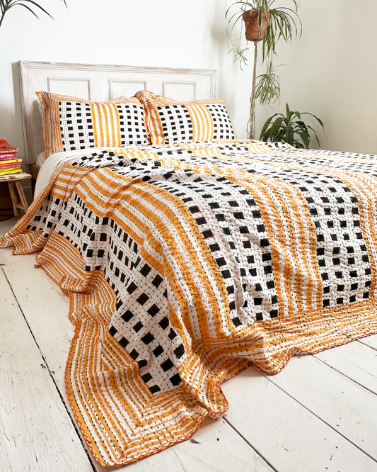 Black and Yellow Geometric Squares Print Cotton Kantha Bedspread
