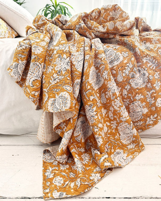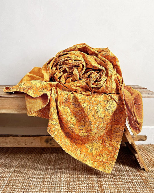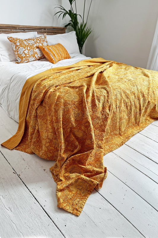 Sunshine Yellow Gold Floral Kantha Quilt Bedspread