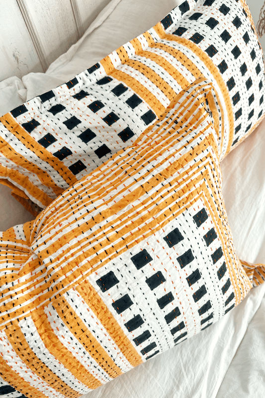 Black and Yellow Geometric Squares Print Handmade Kantha Pillowcase