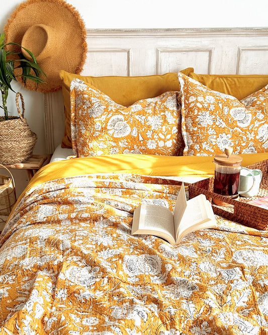 Mustard Yellow Floral Kantha Handmade Pillowcase