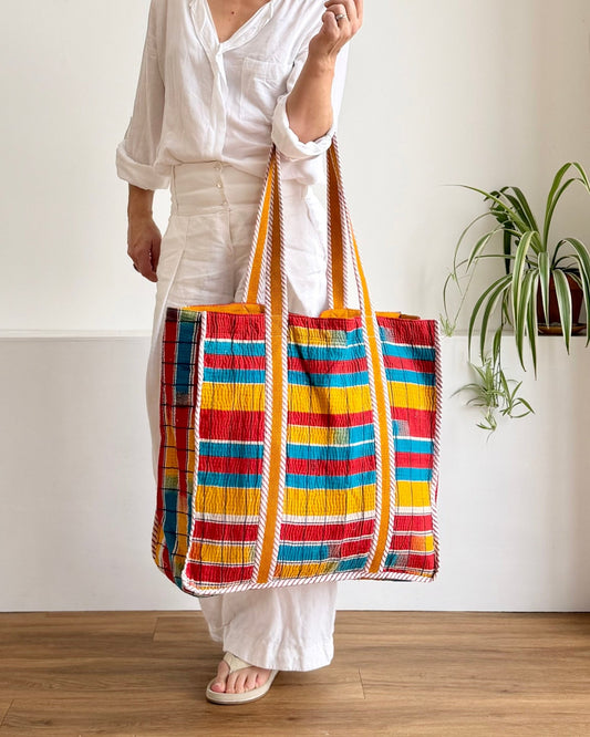 Each one handmade from offcuts of damaged kantha quilts, our unique bags celebrate these hand stitched, vintage textiles in a new, colourful and practical day-to-day form.