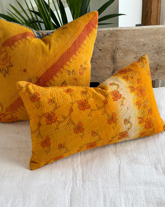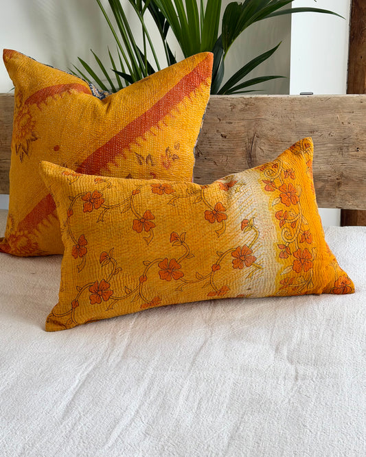Vintage Kantha Cushion In Yellow Floral- Small Rectangular