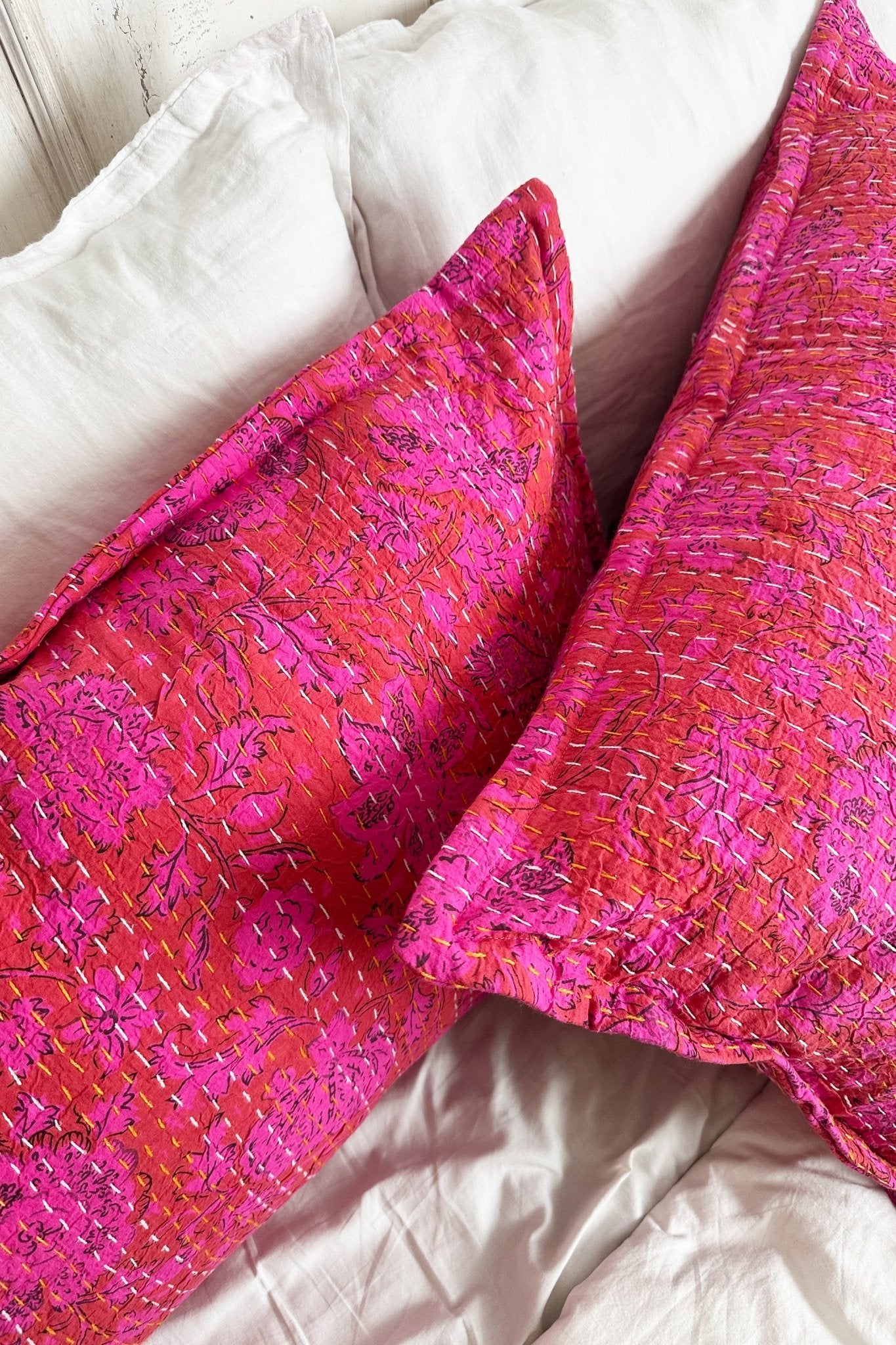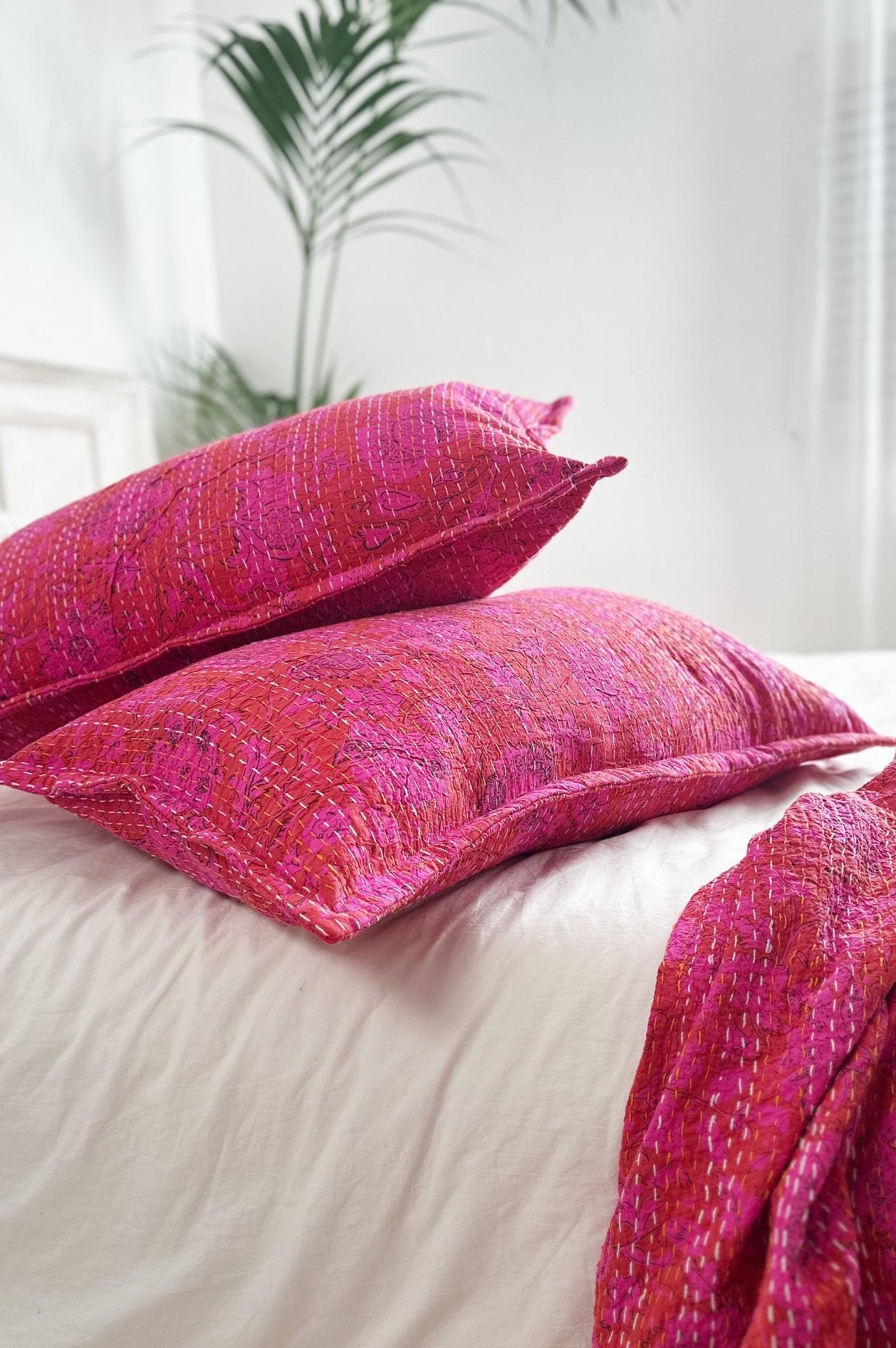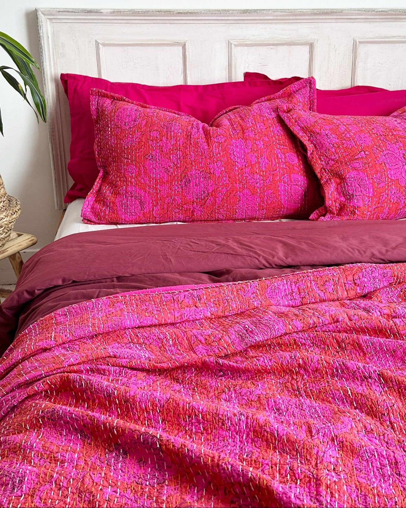 Gorgeously tactile, these hand kantha-stitched pillow covers in a hand block printed hot pink floral pattern will add that extra level of detail and texture for an extra vibrant bedroom setup.