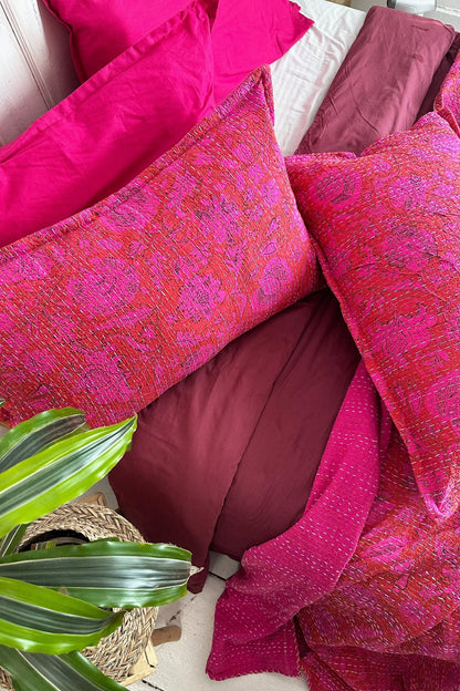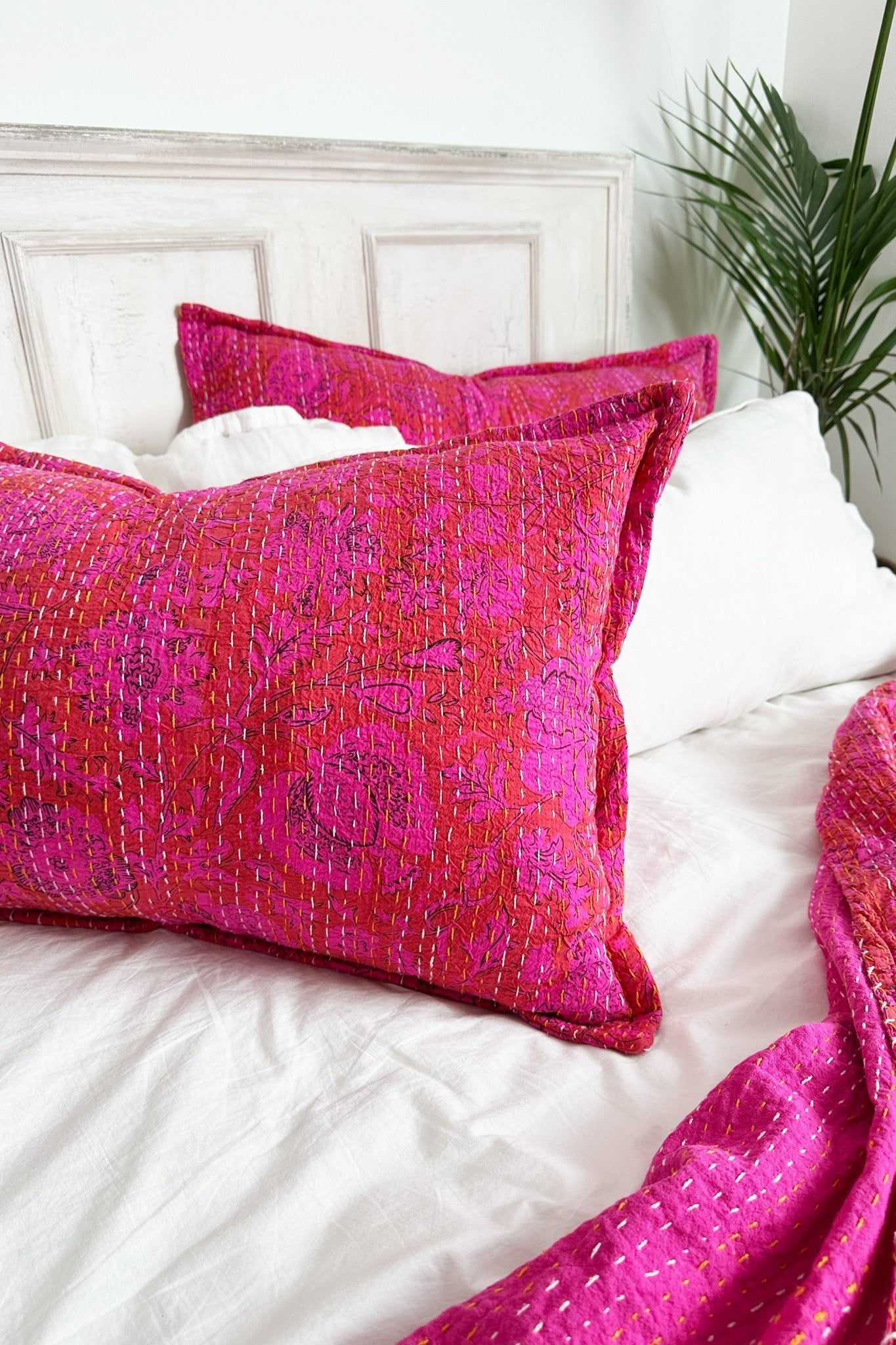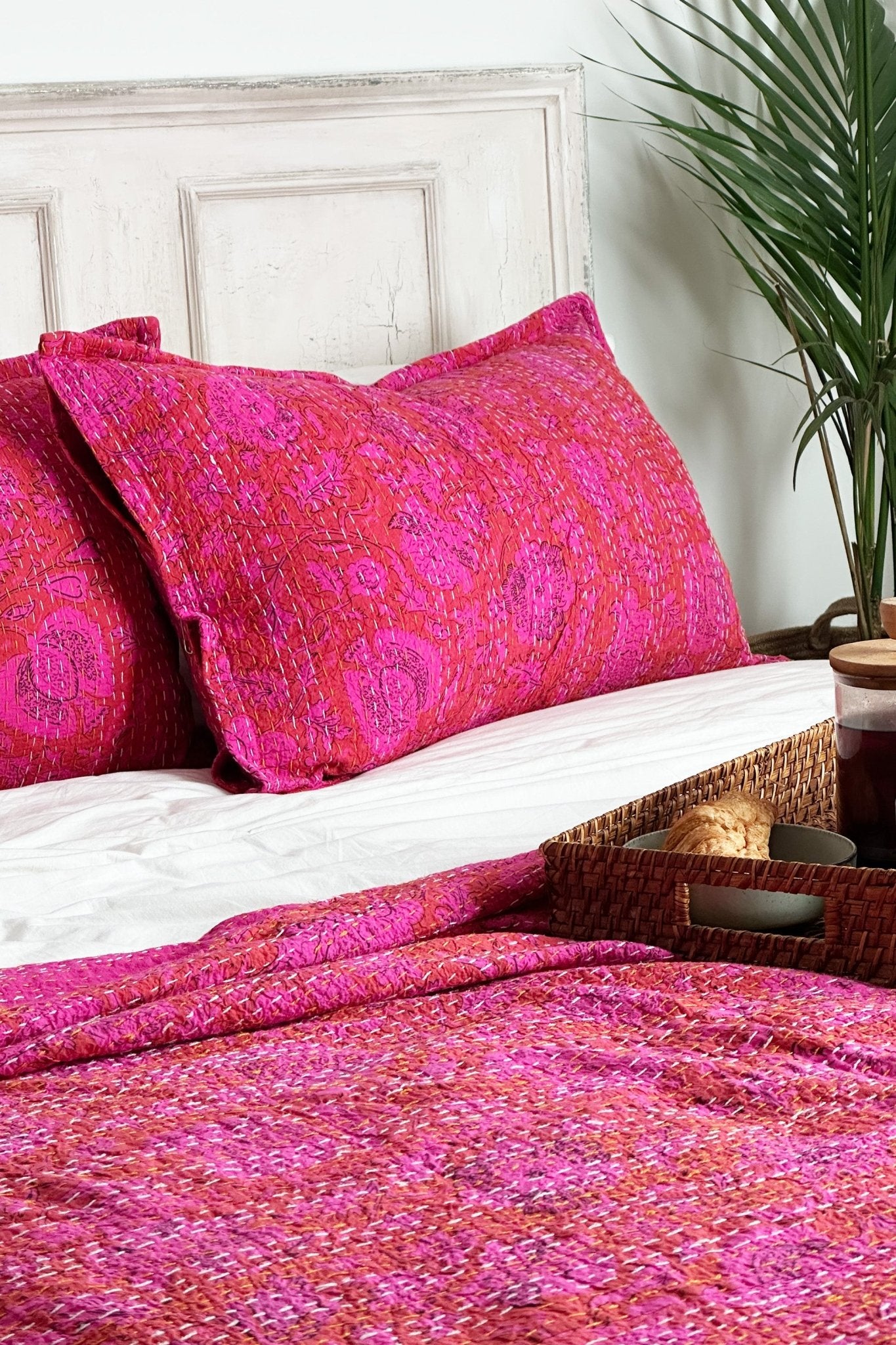 Gorgeously tactile, these hand kantha-stitched pillow covers in a hand block printed hot pink floral pattern will add that extra level of detail and texture for an extra vibrant bedroom setup.
