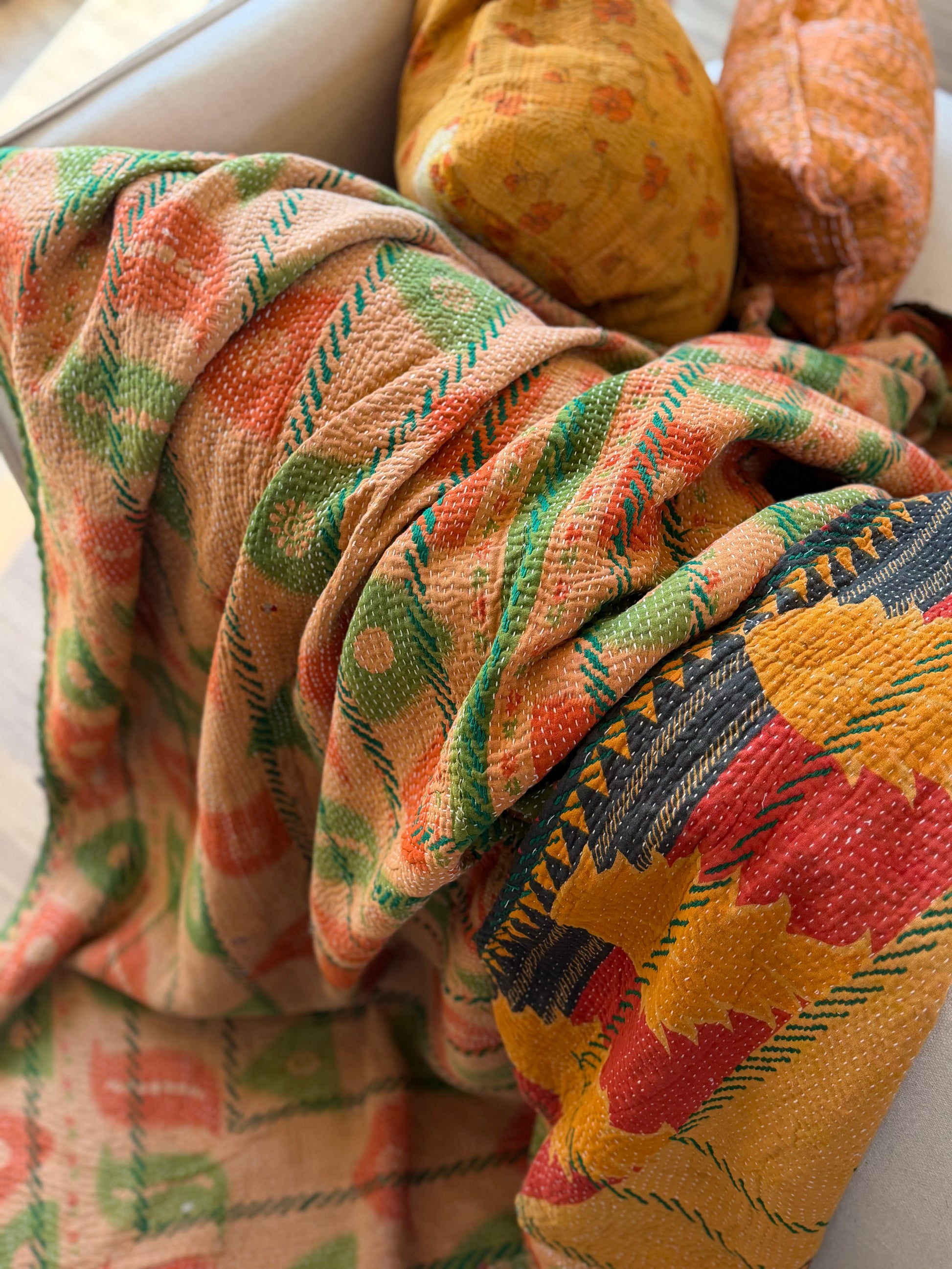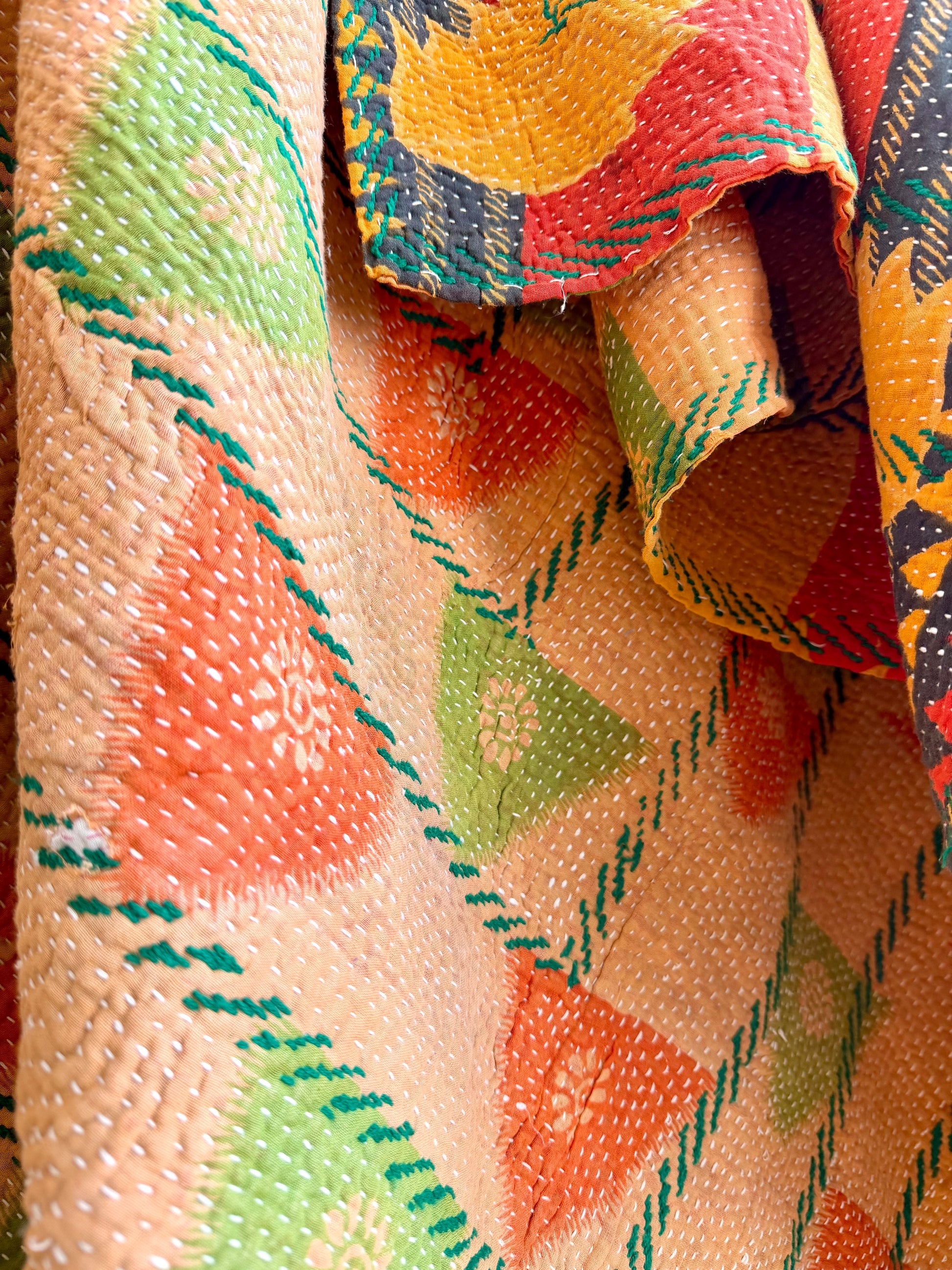 Extra Large Embroidered Vintage Kantha Quilt in Orange and Green