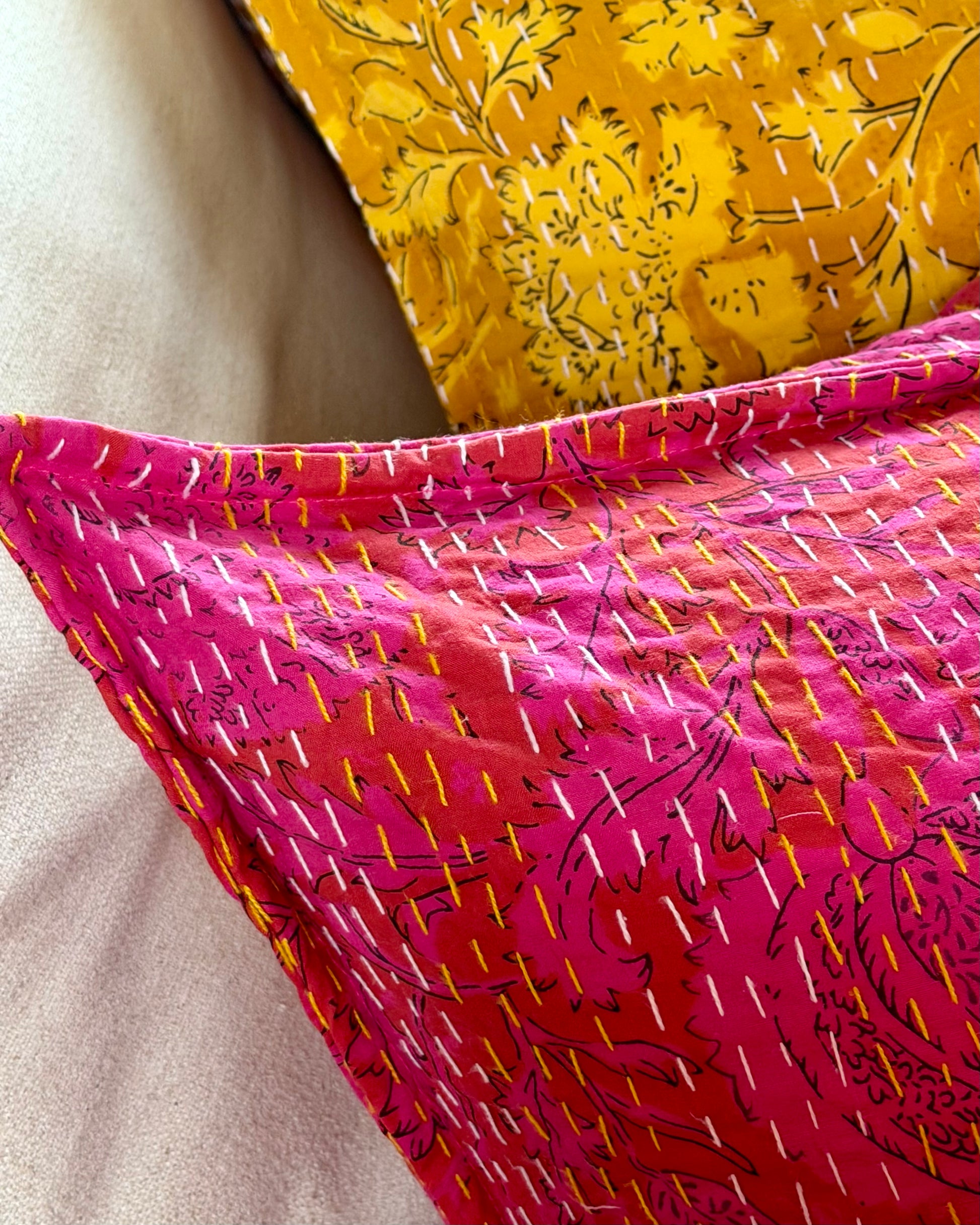Brighten up your space in an instant with our hot pink floral handmade kantha cushion, made from 100% cotton with a block printed pattern, a knife edge finish and kantha hand stitching adding plenty of authentic texture. We make these cushions in different sizes in our studio in the UK using hand block printed cotton kantha-stitch fabric from India.