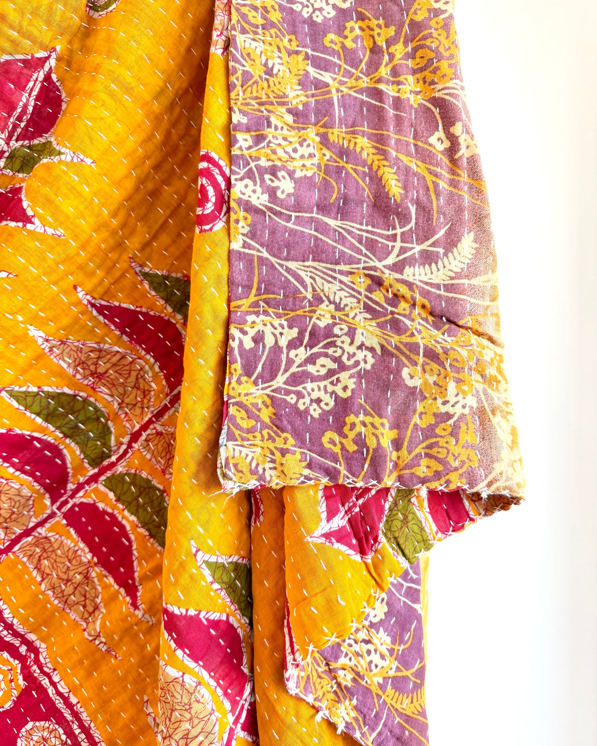 Kantha quilts have been made for centuries by artisans in rural India. They are handmade from layers of recycled hand printed sarees which are hand stitched together to create a reversible, one of a kind blanket. Each one is completely unique and come in different sizes, thicknesses and qualities. We hand select our kantha quilts for their bright colours, versatile sizes and unique patterns, and photograph them in as much detail as possible so that you can see the beautiful features of each one.