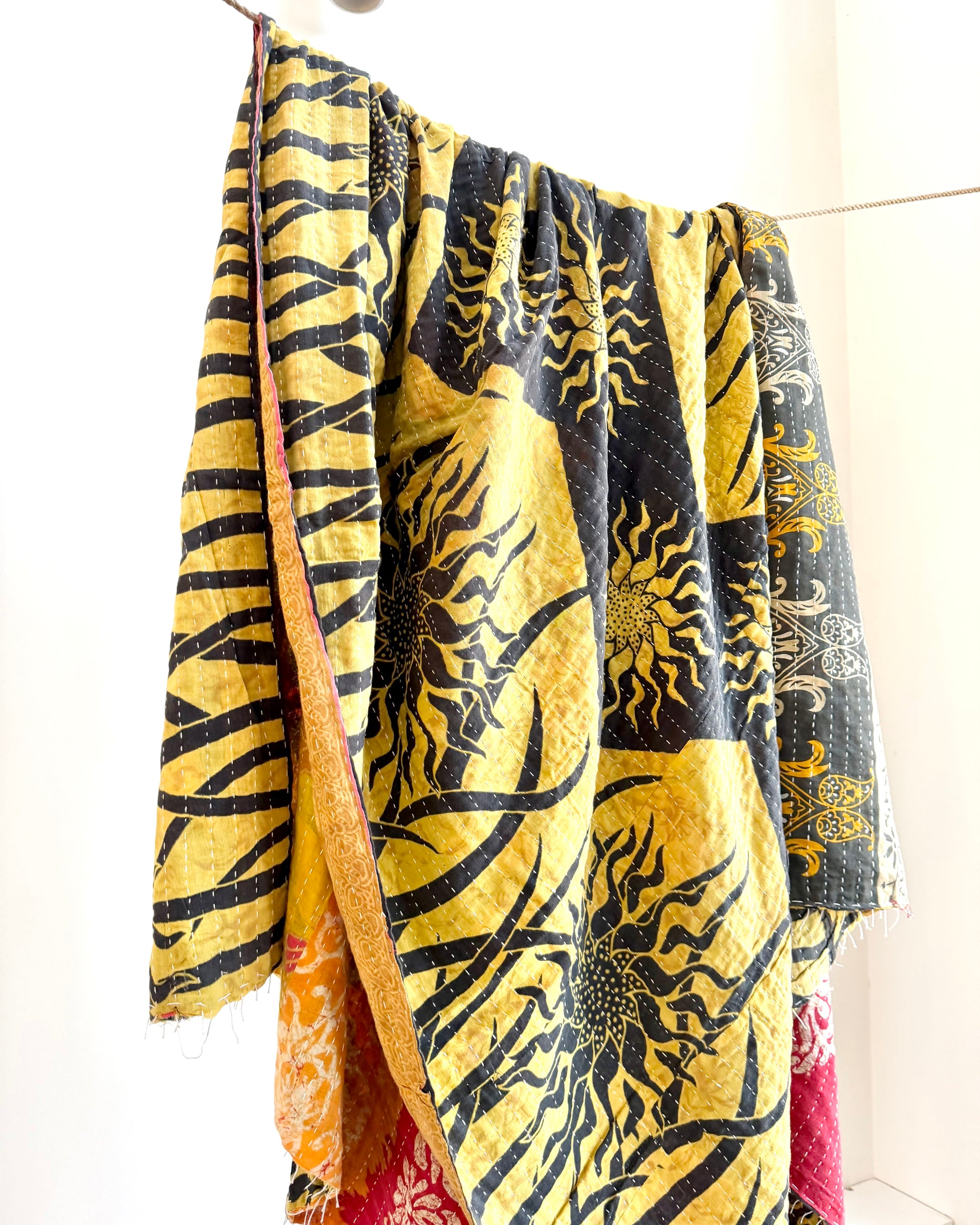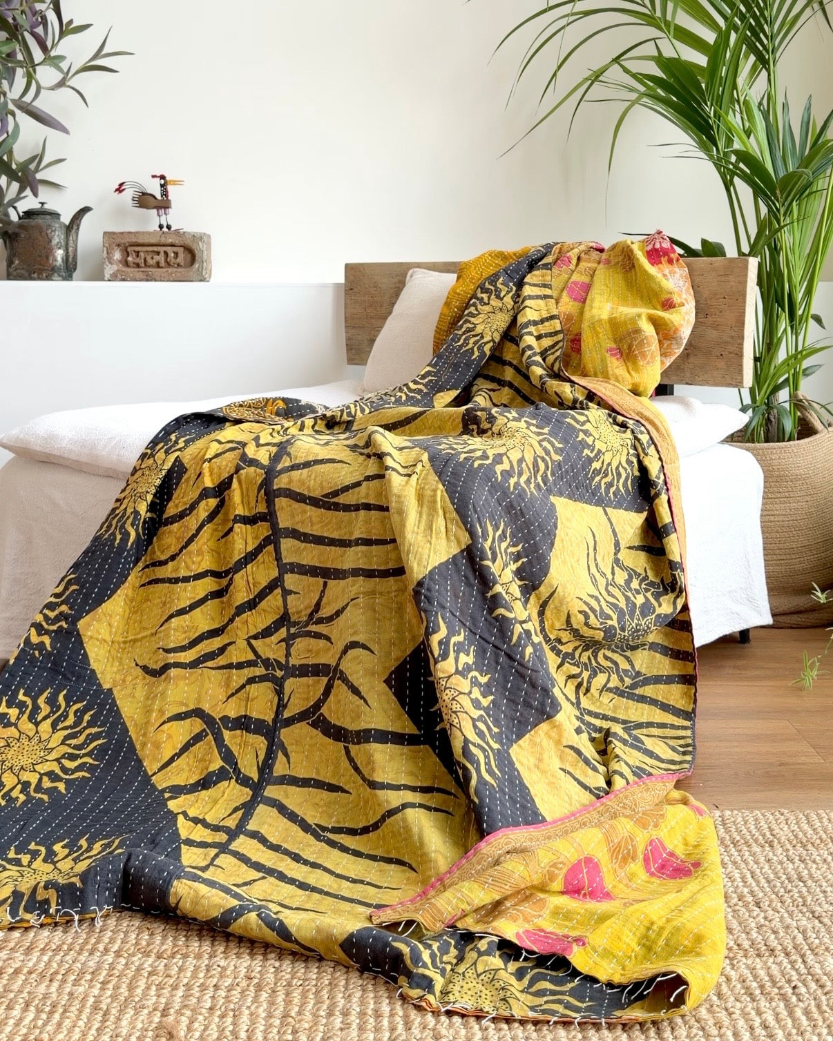 Kantha quilts have been made for centuries by artisans in rural India. They are handmade from layers of recycled hand printed sarees which are hand stitched together to create a reversible, one of a kind blanket. Each one is completely unique and come in different sizes, thicknesses and qualities. We hand select our kantha quilts for their bright colours, versatile sizes and unique patterns, and photograph them in as much detail as possible so that you can see the beautiful features of each one.