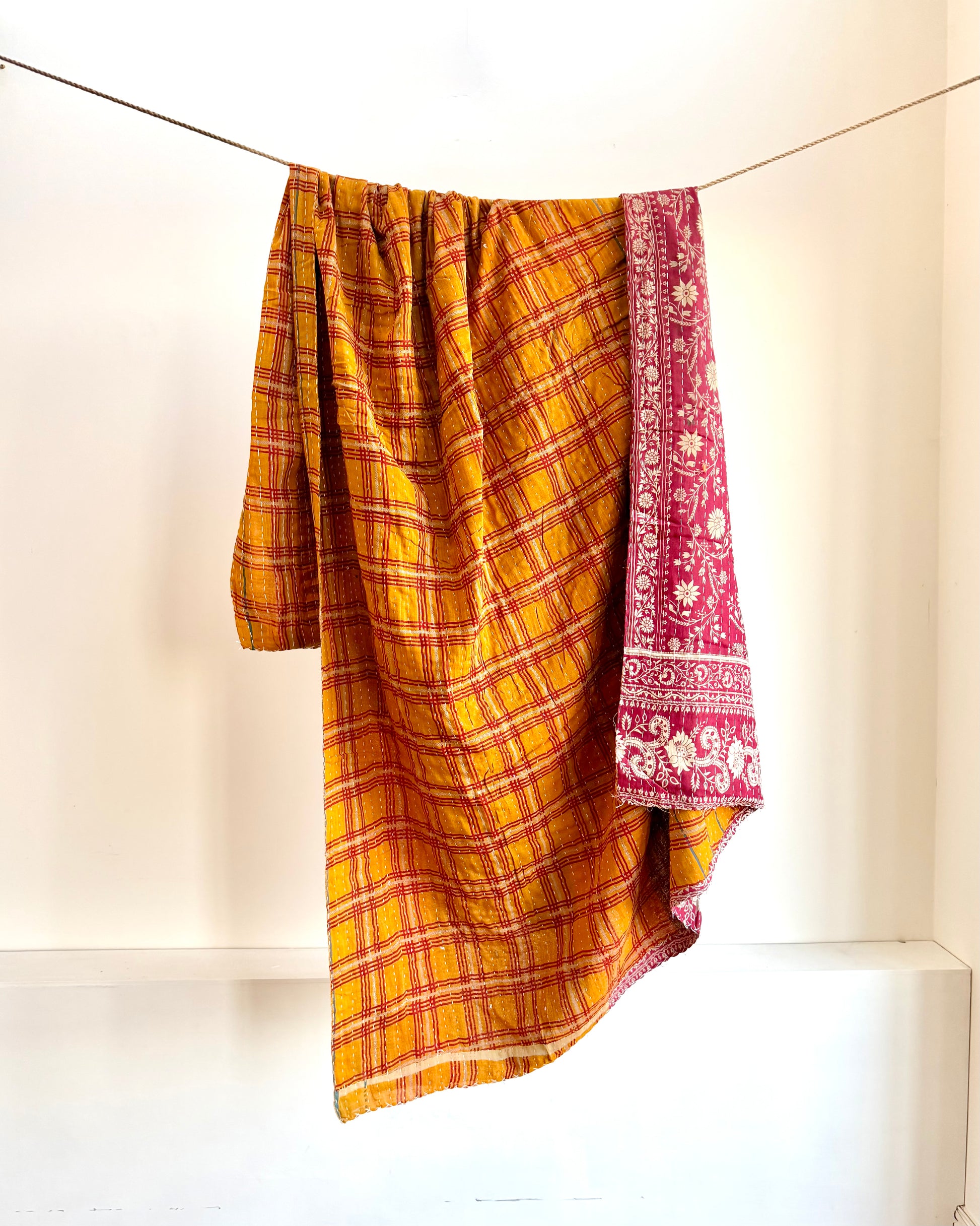 Vintage Cotton Kantha Quilt In Mustard And Red #42