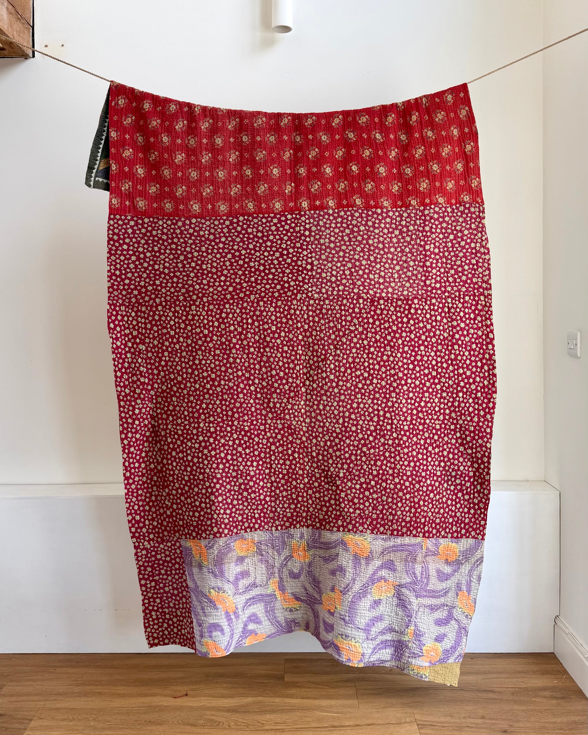 Kantha quilts have been made for centuries by artisans in rural India. They are handmade from layers of recycled hand printed sarees which are hand stitched together to create a reversible, one of a kind blanket.