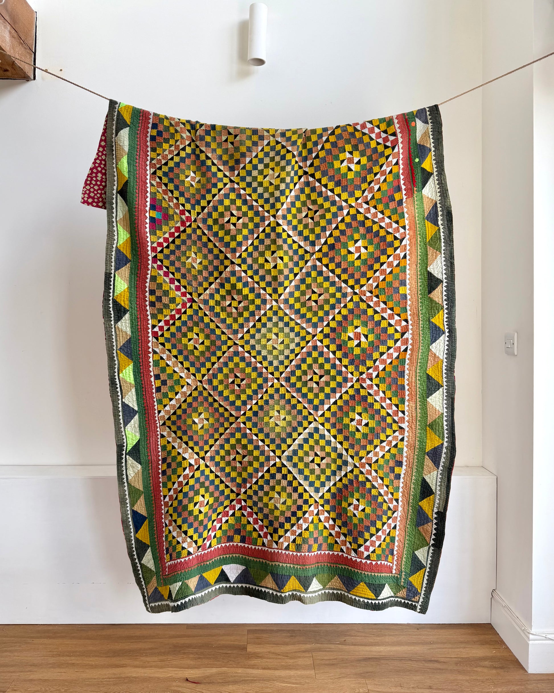 This large, beautifully soft vintage patchwork ralli quilt originally comes from the western side of India/Pakistan region. Tiny hand stitched patchwork triangles and squares make up the detailed pattern, made using recycled cotton.