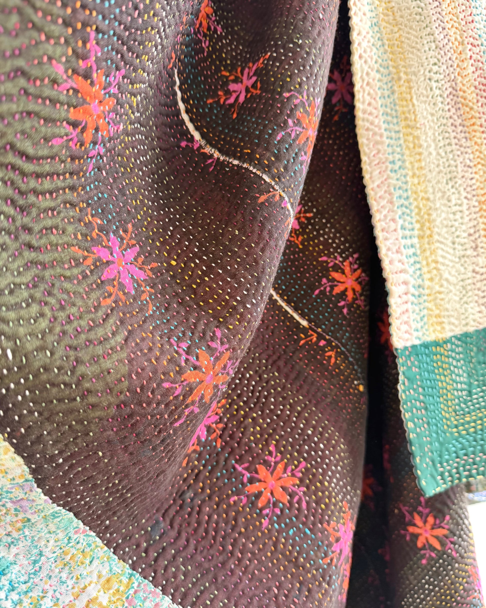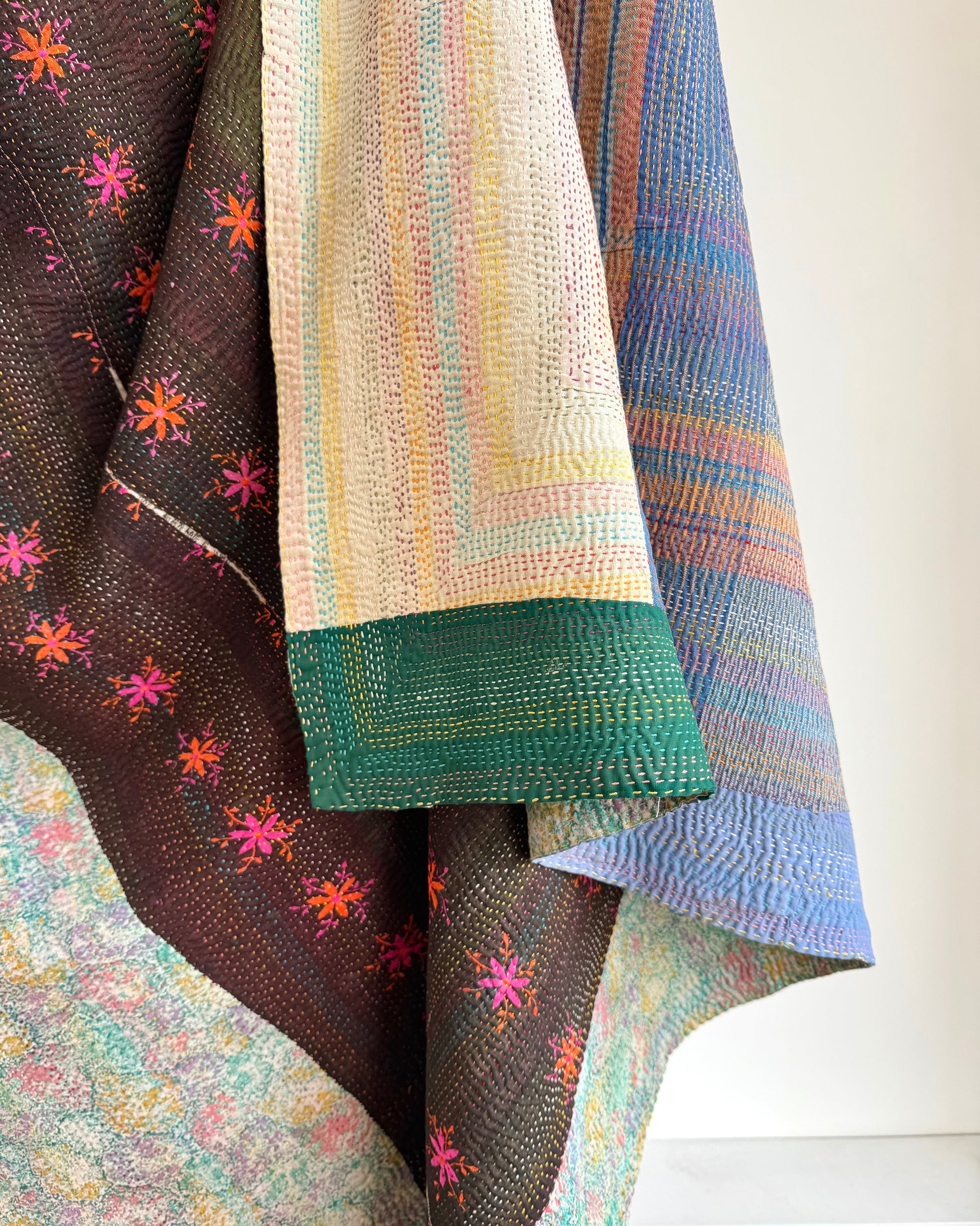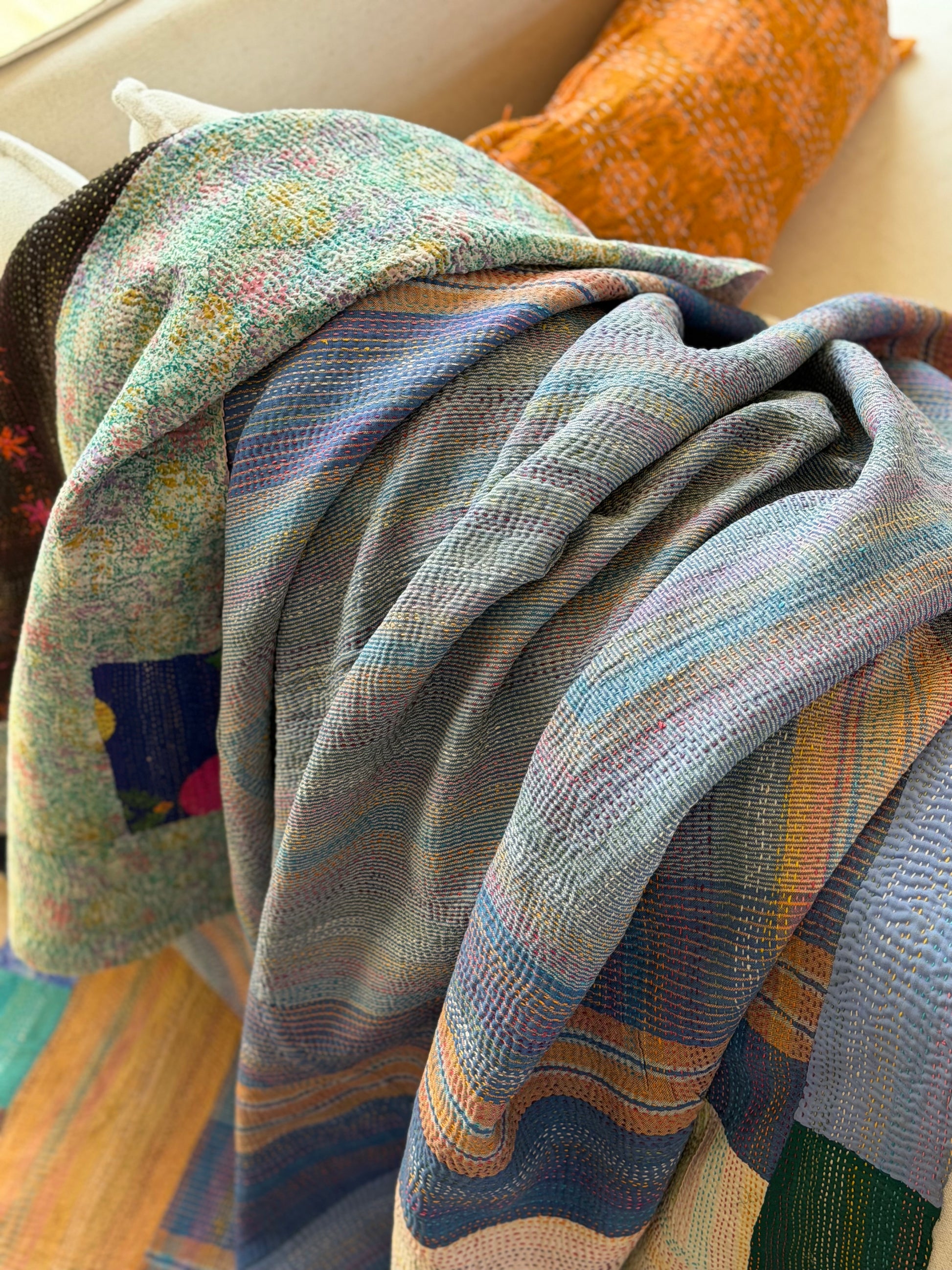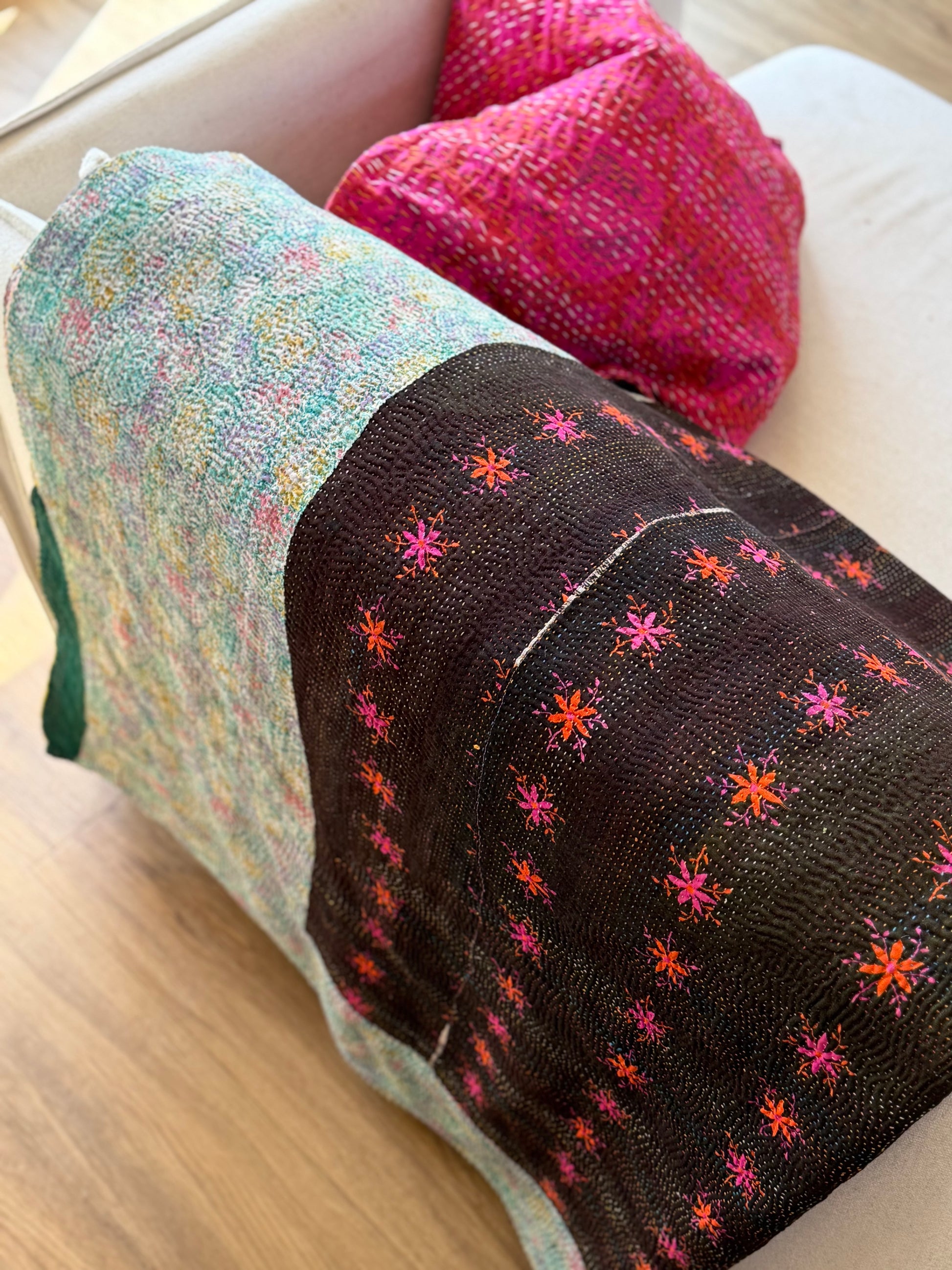 Kantha quilts have been made for centuries by artisans in rural India. They are handmade from layers of recycled hand printed sarees which are hand stitched together to create a reversible, one of a kind blanket.