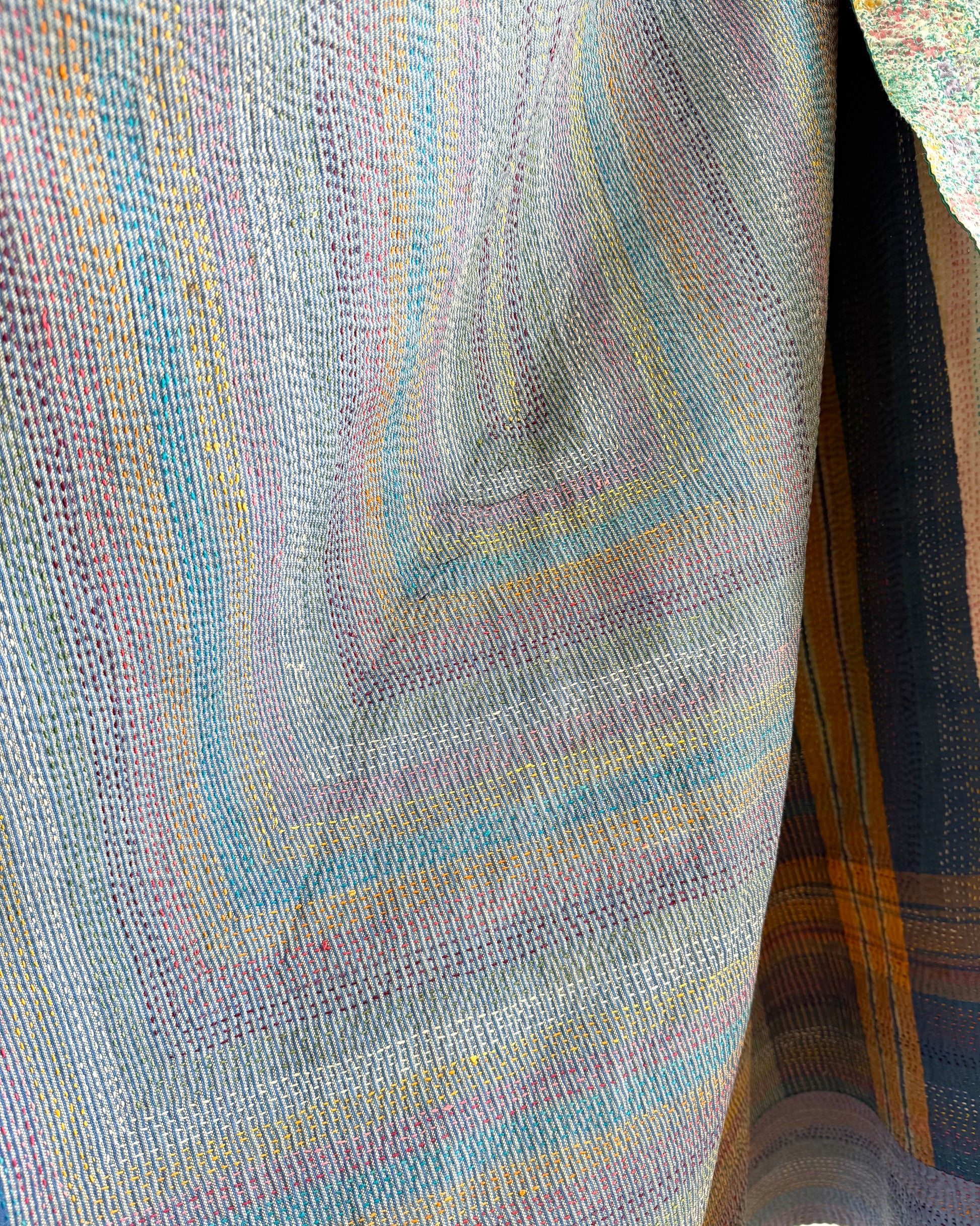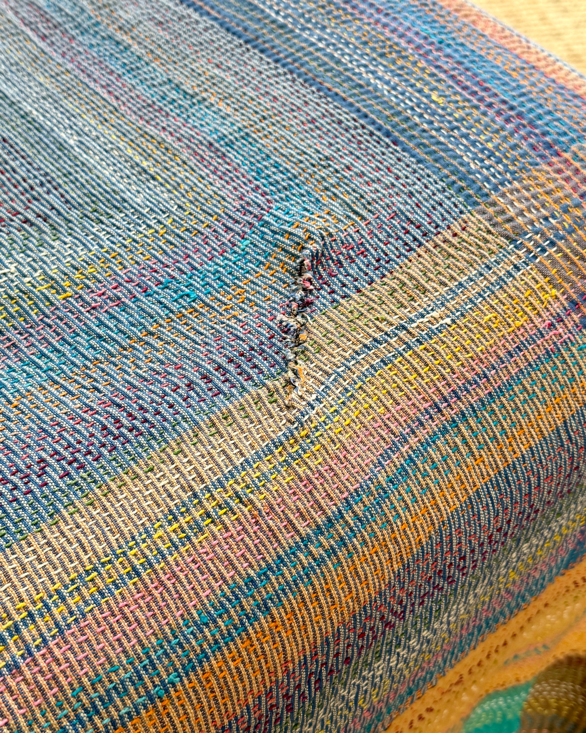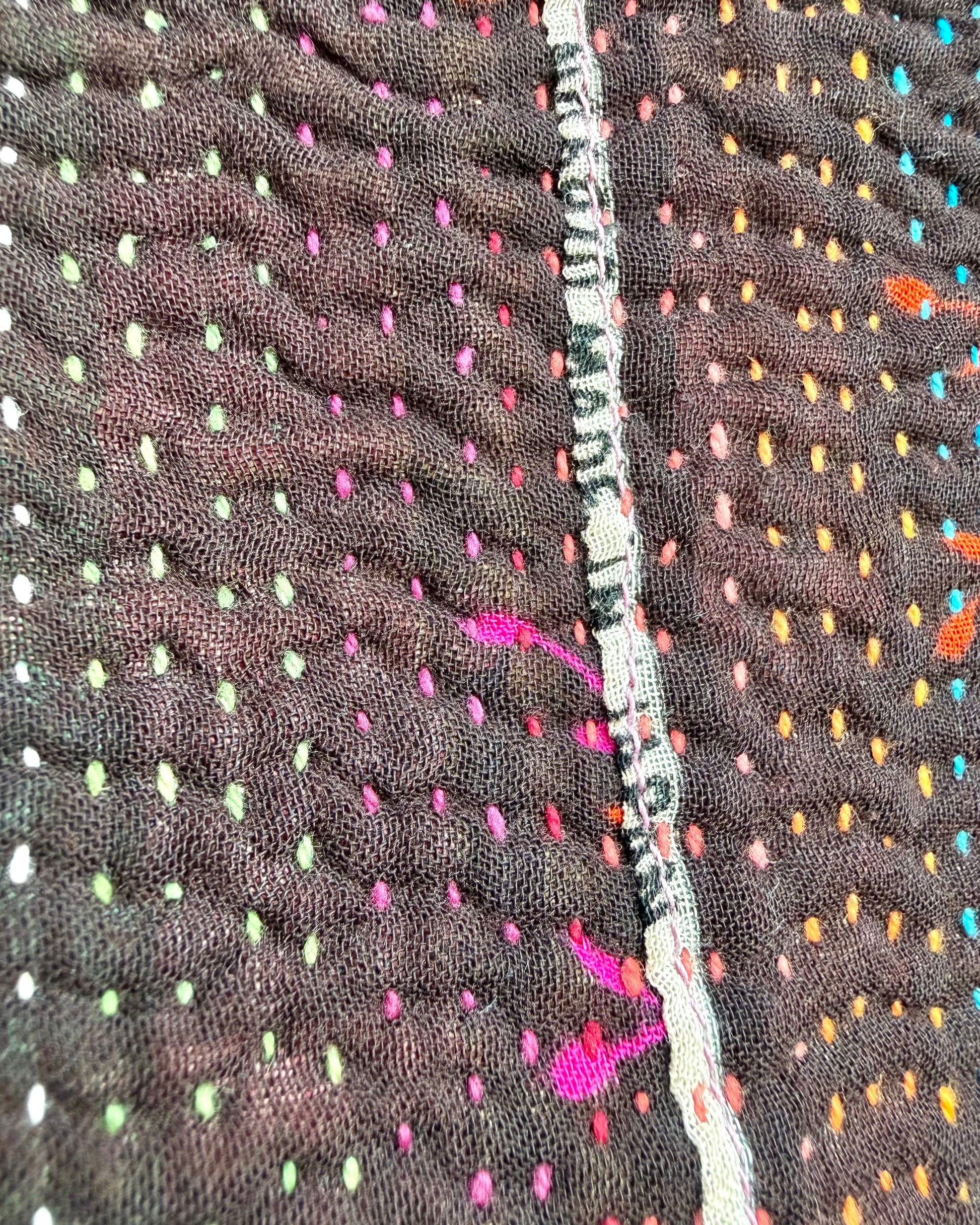 We wash them to remove as many marks as possible, and we will sometimes patch over any large holes using offcuts of kantha quilts, using the same technique as the original artisans would have.