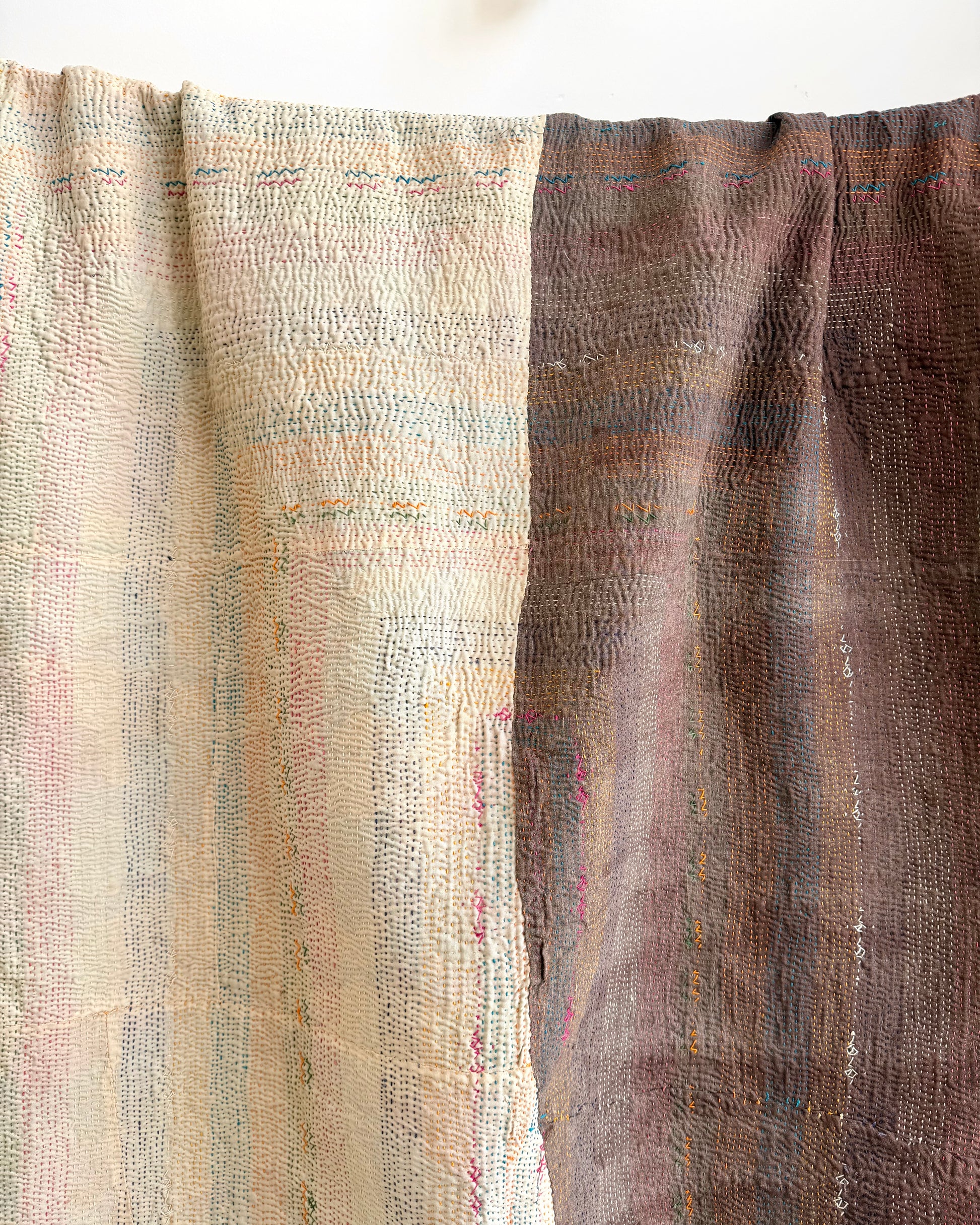 Made from recycled saris layered together like a kantha, the decorative stitches are usually formed in rectangles, some with highly detailed bands of alternating patterns. This one is a relatively simple design but still incredibly intricate.