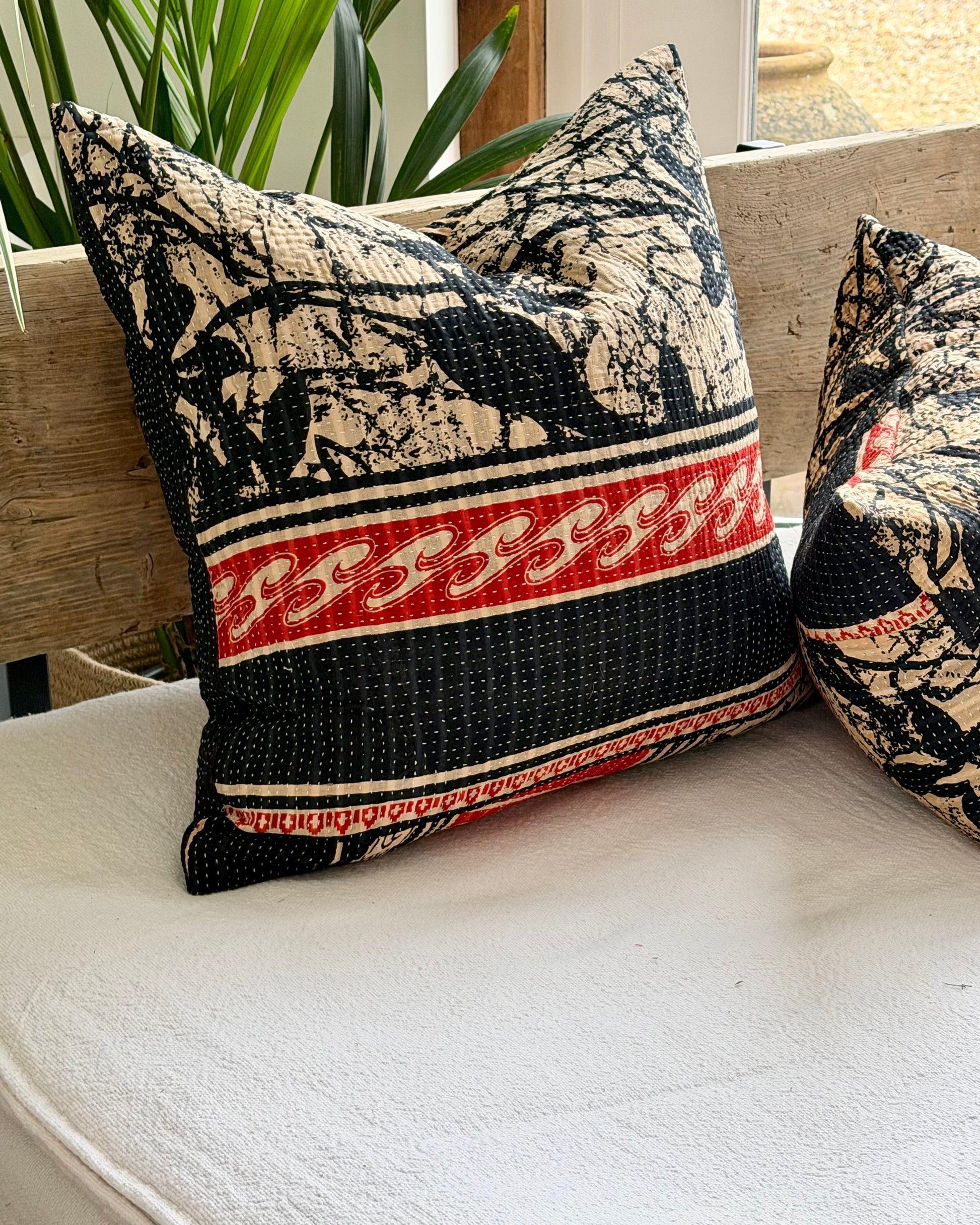 Vintage Kantha Cushion In Black and Red- 45cm Square