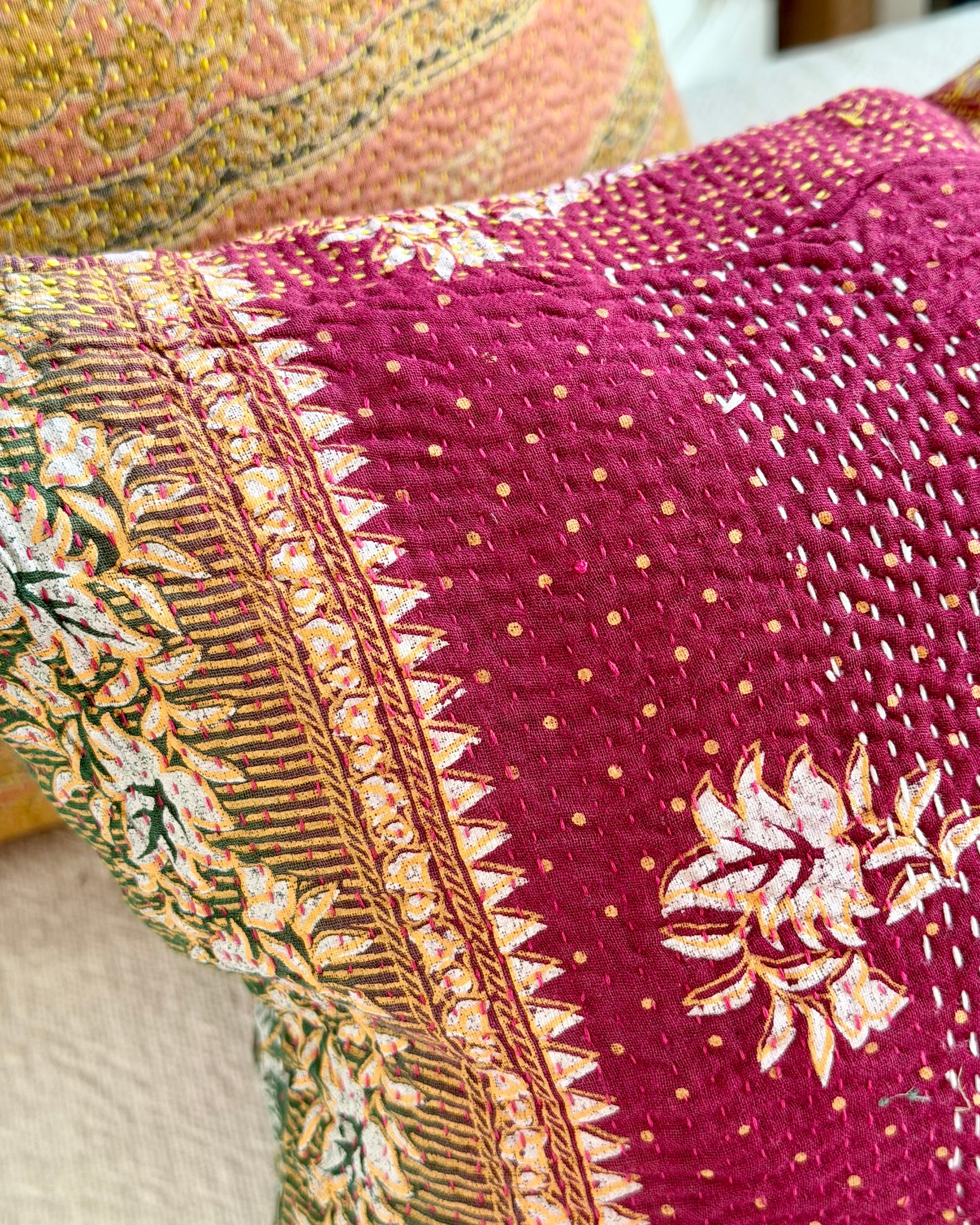 Our vintage kantha cushions are made from old damaged kantha quilts still too beautiful to discard, so we turn them into unique, one-of-a-kind cushions.