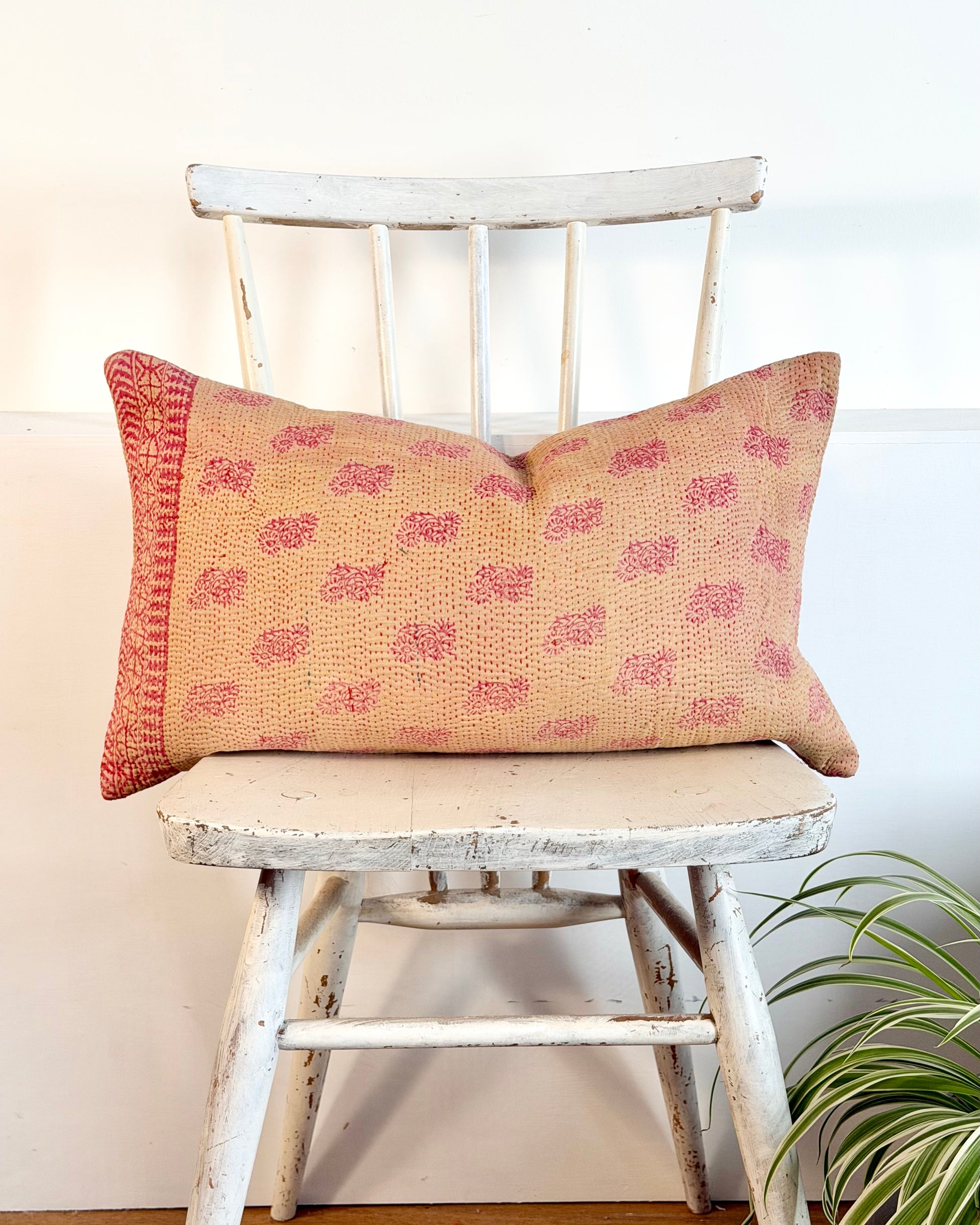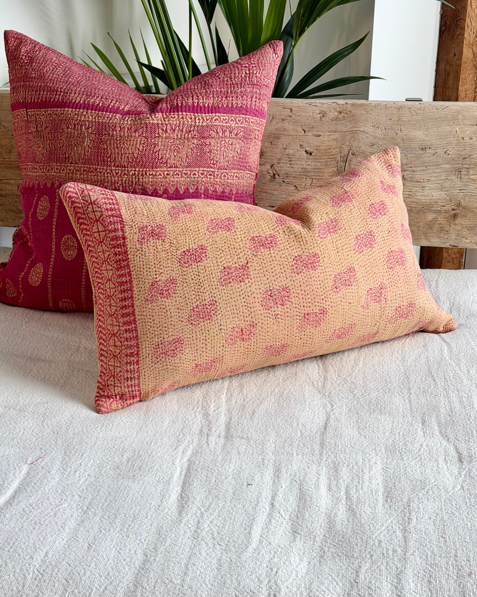 Vintage Kantha Cushion In Pink and Beige - Small Rectangular